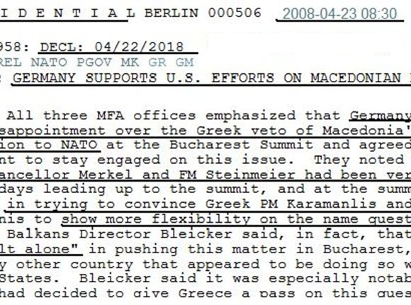 Το έγγραφο αναφέρει πως μόνο η Γερμανία απ’ όλα τα υπόλοιπα κράτη συντάσσεται με την πολιτική των ΗΠΑ και συμμερίζεται την απογοήτευση τους για το ελληνικό βέτο στην είσοδο της… “Μακεδονίας” στο ΝΑΤΟ, ενώ τονίζει πως η ίδια η Μέρκελ δραστηριοποιήθηκε ιδιαίτερα τις ημέρες πριν τη σύνοδο του ΝΑΤΟ, προκειμένου να πείσει τον Καραμανλή να βάλει νερό στο κρασί του!