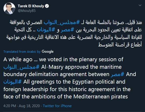 «Πριν από λίγο ψηφίσαμε στην ολομέλεια του Κοινοβουλίου. Οι Αιγύπτιοι εγκρίναμε την οριοθέτηση των θαλασσίων συνόρων ανάμεσα σε Ελλάδα και Αίγυπτο. τους χαιρετισμούς μας στην Αιγυπτιακή πολιτική και επί των Εξωτερικών ηγεσία γι αυτή την ιστορική συμφωνία «στα μούτρα» των φιλοδοξιών των πειρατών της Μεσογείου».