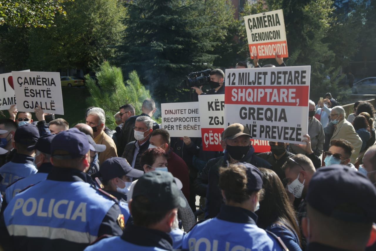 «Μην αγγίζετε την Αλβανία, μην ξεχνάτε την Τσαμουριά» φώναζαν οι διαδηλωτές, απαιτώντας από την κυβέρνηση της χώρας τους να επιλύσει το «τσάμικο» και να καταργήσει το νόμο περί εμπολέμου.