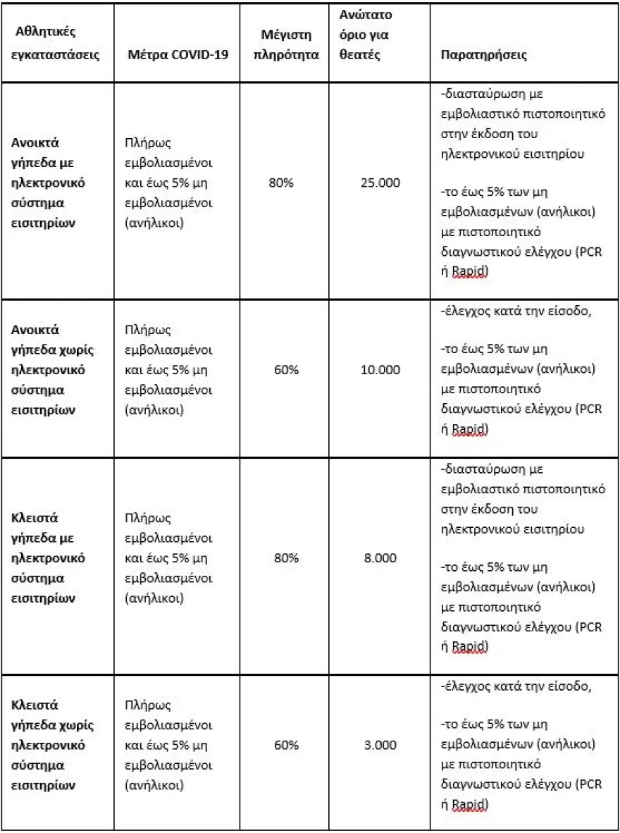 Η πληρότητα των αθλητικών εγκαταστάσεων, αναλόγως αν διαθέτουν ή όχι ηλεκτρονικό σύστημα εισιτηρίων, θα φτάσει έως και το 80% μόνο με εμβολιασμένους θεατές (εννοούνται και οι νοσήσαντες με ανάλογο πιστοποιητικό), με υποχρεωτική χρήση μάσκας, ποσοστό ανήλικων που δεν μπορούν να εμβολιασθούν, ως ακολούθως: