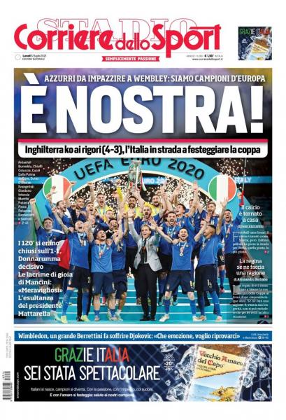 «Είναι δικό μας. Τρελοί ατζούρι στο Γουέμπλει», γράφει στο πρώτο φίλο η «Corriere dello Sport», με την «Gazzetta dello Sport» να έχει τίτλο: «Γιορτή στα πέναλτι στο Γουέμπλεϊ, Πάρα πολύ όμορφο, η Ιταλία πρωταθλήτρια Ευρώπης».