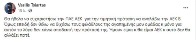 Ο Βασίλης Τσίαρτας απάντησε αρνητικά στην πρόταση για να αναλάβει την δεύτερη ομάδα της ΑΕΚ, ενώ μέσα από τα social media αποκάλυψε και τον λόγο.