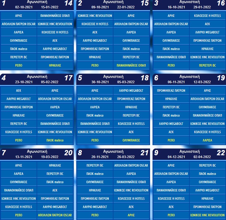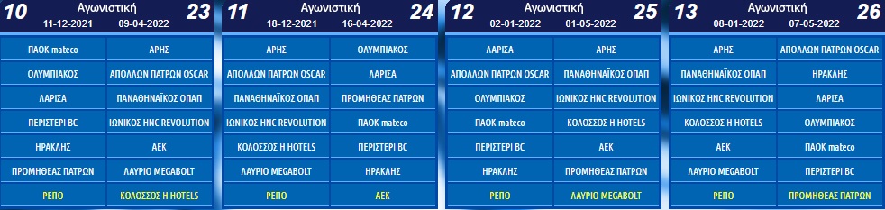Την έβδομη αγωνιστική θα γίνει το Παναθηναϊκός-ΑΕΚ και την δέκατη το ΠΑΟΚ-Άρης. Η κανονική περίοδος θα ολοκληρωθεί το πρώτο δεκαήμερο του Μαΐου και θα ακολουθήσουν τα playoffs.