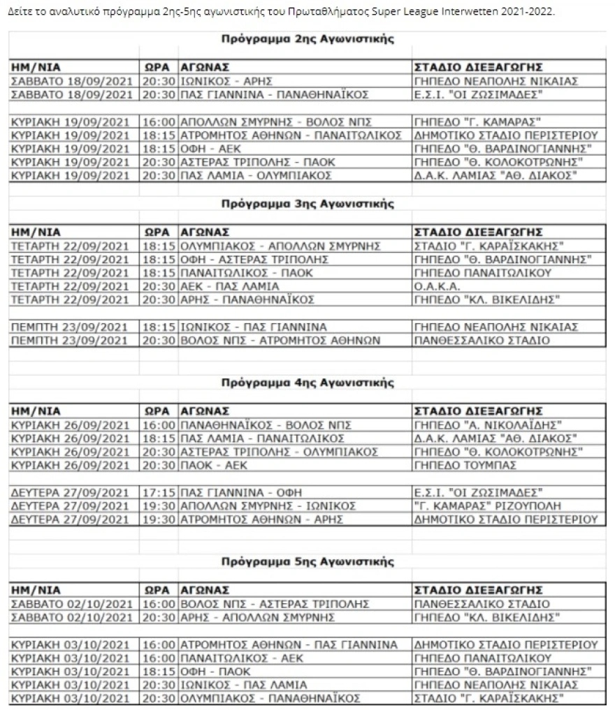 H SuperLeague γνωστοποίησε το πρόγραμμα από τη 2η έως και την 5η αγωνιστική του πρωταθλήματος, λίγες ώρες μετά την ολοκλήρωση της Γενικής Συνέλευσης.