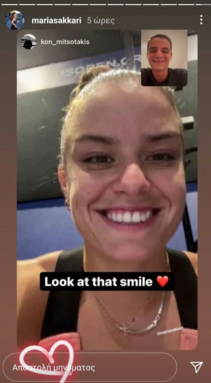 Μπορεί ο σύντροφός της Κωνσταντίνος Μητσοτάκης να μην μπόρεσε να βρεθεί στις ΗΠΑ για να την στηρίξει από κοντά αλλά, όπως φαίνεται από τις αναρτήσεις τους, η επικοινωνία τους είναι συνεχής. Ο γιος του Πρωθυπουργού, μάλιστα, ανάρτησε μια φωτογραφία στην οποία συνομιλεί μέσω βιντεοκλήσης με την τενίστρια και γράφει: «Δείτε αυτό το χαμόγελο». Η Μαρία Σάκκαρη φυσικά έκανε repost την ανάρτηση.