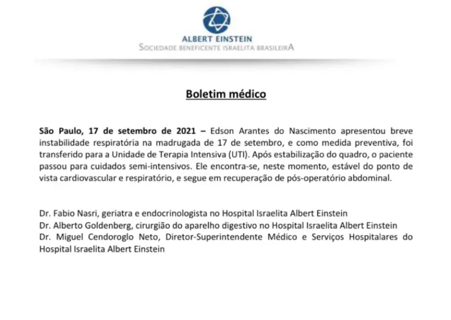 Ο Έντσον Αράντες ντο Νασιμέντο παρουσίασε ήπια αναπνευστική αστάθεια το πρωί της Παρασκευής και ως προληπτικό μέτρο μεταφέρθηκε στη Μονάδα Εντατικής Θεραπείας. Η κατάστασή του είναι σταθερή και πλέον βρίσκεται σε μονάδα ημι-εντατικής φροντίδας», αναφέρει σε ανακοίνωση του το νοσοκομείο Albert Einstein του Σάο Πάολο.