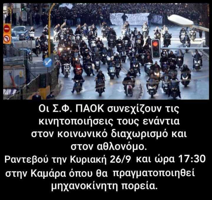 «Οι Σ.Φ. ΠΑΟΚ συνεχίζουν τις κινητοποιήσεις τους ενάντια στον κοινωνικό διαχωρισμό και στον αθλονόμο. Ραντεβού την Κυριακή και ώρα 17.30 στην Κάμαρα όπου θα πραγματοποιηθεί μηχανοκίνητη πορεία», αναφέρεται σε σχετική ανακοίνωση των οπαδών του ΠΑΟΚ.