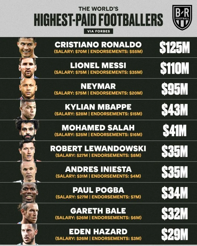Ο Πορτογάλος άσος είναι στην 1η θέση της σχετικής λίστας έχοντας συνολικά 125 εκατ. δολάρια έσοδα, 70 εκατ. από το συμβόλαιο του με την Μάντσεστερ Γιουνάιτεντ και 55 εκατ. δολάρια από τις δικές του χορηγίες με εταιρείες.
