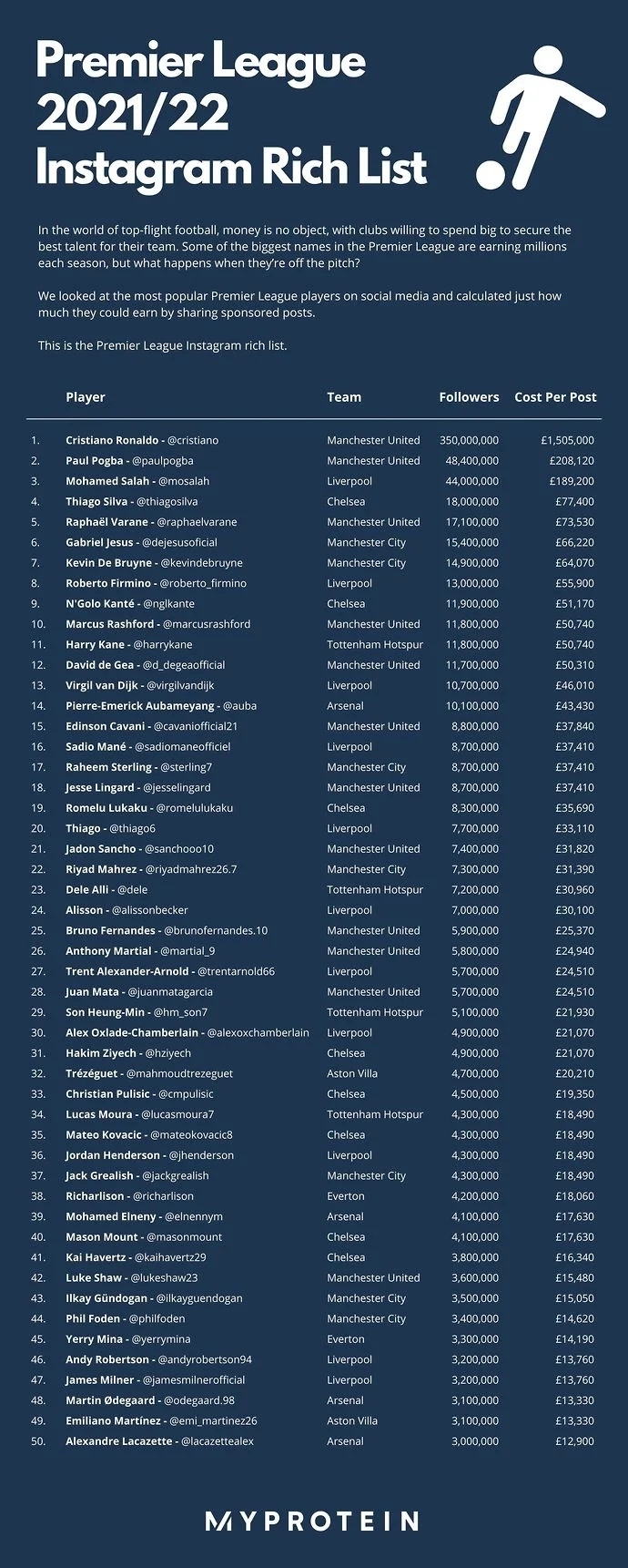 H σχετική λίστα των Influencer στην Premier League από την «MyProtein»: