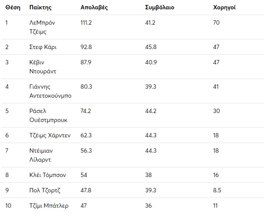 Τον Giannis ξεπερνούν μόνο οι Κέβιν Ντουράντ ($87.9 εκατ.), Στεφ Κάρι ($92.8 εκατ.) και ΛεΜπρόν Τζέιμς, ο μοναδικός που ξεπερνάει τα 100 εκατομμύρια ($111.2 εκατ.).