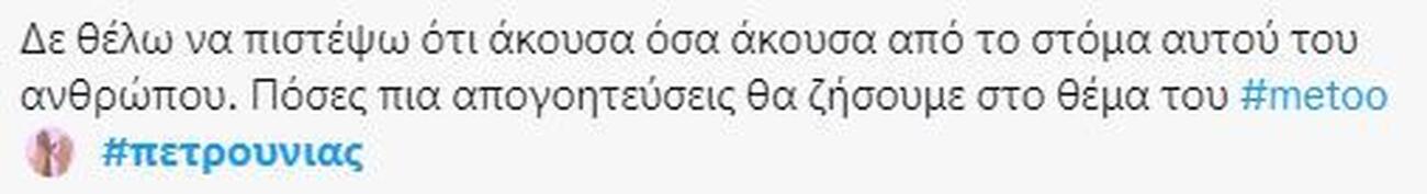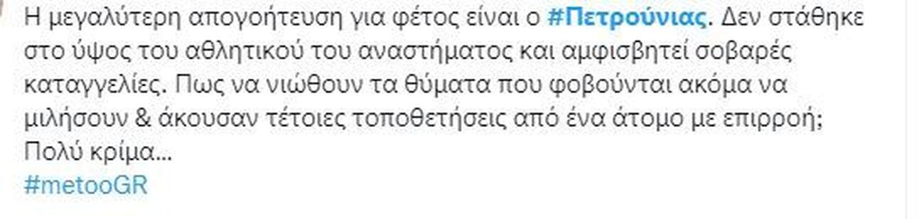 Μία δήλωση του Λευτέρη Πετρούνια σχετικά με το Ελληνικό #metoo ήταν αρκετή για να ξεσηκώσει θύελλα αντιδράσεων. Συγκεκριμένα, σχολίασε τις καταγγελίες περί σεξουαλικής κακοποίησης που έχουν γίνει στον χώρο του αθλητισμού.