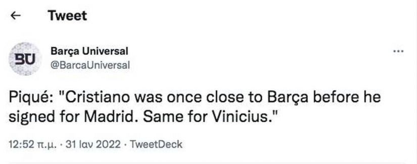 Συγκεκριμένα, ο Ισπανός κεντρικός αμυντικός ανέφερε πως πριν από μερικά χρόνια ο Κριστιάνο Ρονάλντο ήταν έτοιμος να υπογράψει στην Μπαρτσελόνα, προτού τελικά παίξει στη Ρεάλ Μαδρίτης με την οποία διέπρεψε.
