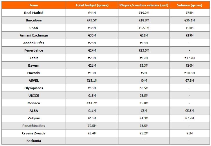Ακολουθούν η Ρεάλ Μαδρίτης με 19,2 εκατ. και η Μπαρτσελόνα με 18,8 εκατ. ευρώ, ενώ την πεντάδα συμπληρώνουν η πρωταθλήτρια Εφές με 15 και η Φενέρμπαχτσε με 13,5 εκατ.