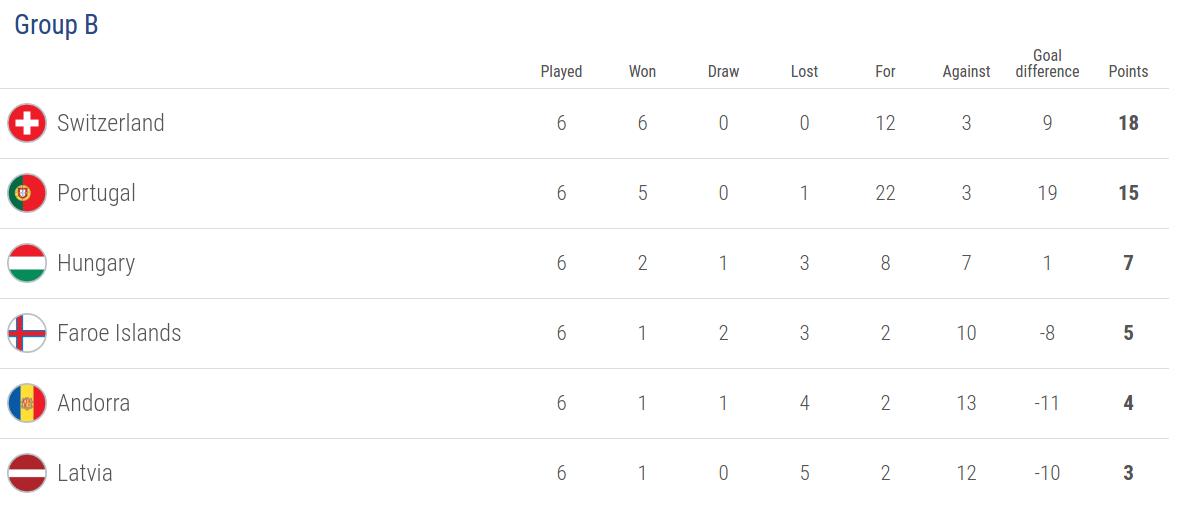 Στον 2o όμιλο μετά την ήττα της Ουγγαρίας από την Ανδόρρα, όλα ξεκαθάρισαν. Ελβετία και Πορτογαλία θα μονομαχήσουν για την 1η θέση. Έχουν το μεταξύ τους παιχνίδι στην Πορτογαλία, στο οποίο λογικά οι Ελβετοί θα πάνε για δύο αποτελέσματα. Αν οι δύο ομάδες ισοβαθμήσουν, τότε η Πορτογαλία θα έχει το πάνω χέρι αφού έχει ήδη αναπτύξει μεγάλη διαφορά τερμάτων.
