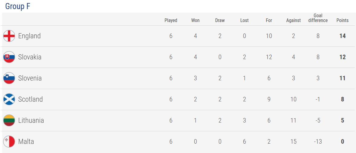 Στον 6ο όμιλο, η Αγγλία περιορίστηκε στην ισοπαλία απέναντι στην Σκωτία και είδε την Σλοβακία αλλά και την Σλοβενία να μειώνουν τη διαφορά από την κορυφή. Λογικά η ομάδα του Γκάρεθ Σάουθγκεϊτ δεν θα αντιμετωπίσει πρόβλημα στη μάχη της πρωτιάς και το ενδιαφέρον πλέον θα μεταφερθεί στη μάχη της 2ης θέσης ανάμεσα σε Σλοβάκους και Σλοβένους, με τους πρώτους να έχουν και αρκετά καλύτερη διαφορά τερμάτων.