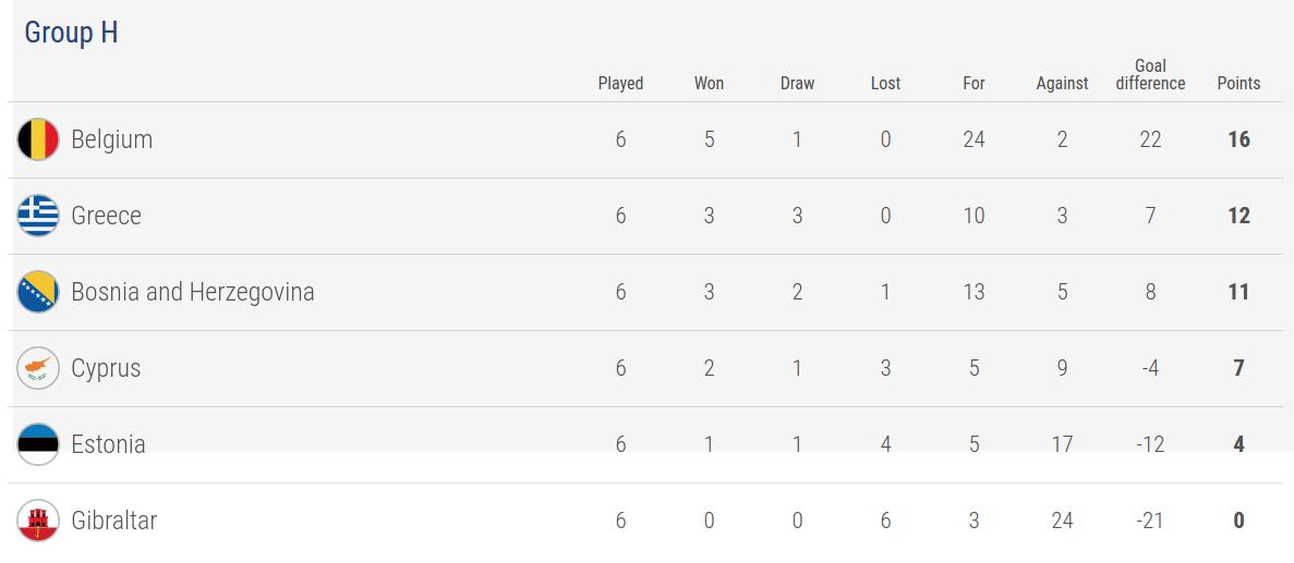 Στον όμιλο της Εθνικής μας, το Βέλγιο θα πρέπει να προσπαθήσει πολύ για να χάσει την πρώτη θέση. Εχει να αντιμετωπίσει Ελλάδα και Βοσνία εκτός έδρας ωστόσο μόνο με δύο ήττες θα μπει σε κίνδυνο. Η Ελλάδα αν καταφέρει να πάρει τέσσερις νίκες σε ισάριθμα ματς, τότε αδιαφορεί για το τι θα κάνει η Βοσνία, της οποίας επόμενη αντίπαλος είναι η Κύπρος εκτός έδρας. Την ίδια ώρα που η Ελλάδα θα υποδέχεται την Εσθονία και θα ψάξει νίκη με γκολ ώστε να βελτιώσει και τη διαφορά τερμάτων που έχει.