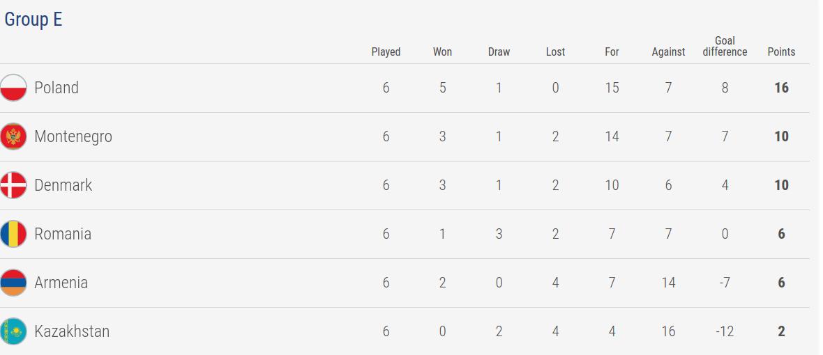 Από εκεί και πέρα όμως, Μαυροβούνιο και Δανία ισοβαθμούν με δέκα βαθμούς ωστόσο ο όμιλος έχει κινηθεί τόσο χαμηλά στη βαθμολογία που δεν αποκλείεται να είναι ο ένας και μοναδικός που δεν θα δώσει ομάδα στα μπαράζ.