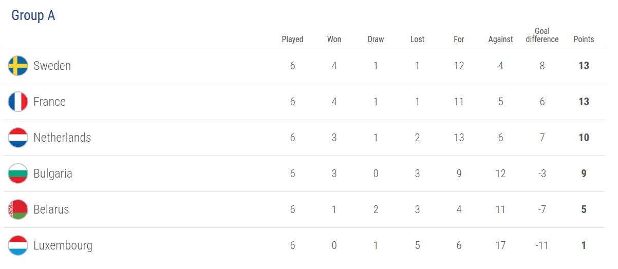 Στον πρώτο όμιλο, η νίκη της Σουηδίας επί της Γαλλίας έμπλεξε ακόμη περισσότερο τα πράγματα. Οι Σουηδοί με καλύτερη διαφορά τερμάτων πέρασαν στην 2η θέση, έχουν ίδιους βαθμούς με τους Γάλλους ενώ η Ολλανδία βρίσκεται στους 10 και απειλεί. Λιγότερες πλέον ελπίδες έχει η Βουλγαρία μετά την ήττα από την Λευκορωσία εκτός έδρας.