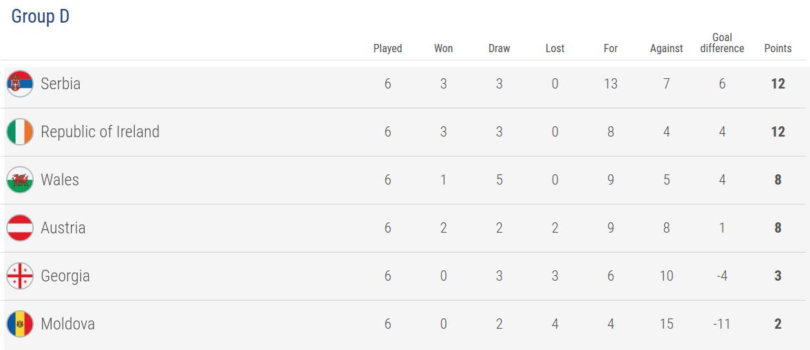 Στον 4ο όμιλο, η Σερβία κατάφερε να αποφύγει την ήττα από την Ουαλία εντός έδρας ισοφαρίζοντας σε 1-1 λίγο πριν το φινάλε. Κράτησε την πρώτη θέση, στην οποία έχει συγκάτοικο την Ιρλανδία, η οποία ισοφάρισε στο τέλος τους Αυστριακούς. Και σε αυτό τον όμιλο, δύσκολα θα αλλάξει η κατάσταση αφού Ουαλοί και Αυστριακοί βρίσκονται πλέον στο -4.