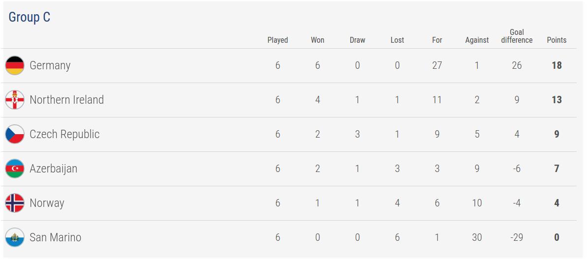 Στον 3ο όμιλο, η Β.Ιρλανδία εκμεταλλεύτηκε την ισοπαλία ανάμεσα στην Νορβηγία και την Τσεχία, αυξάνοντας τη διαφορά της. Επικράτησε του Αζερμπαϊτζάν εκτός έδρας και πλέον βρίσκεται στη 2η θέση με απόσταση τεσσάρων βαθμών από τους Τσέχους ενώ υπετερεί και στη διαφορά τερμάτων.
