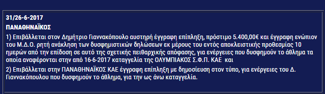 Ύστερα από καταγγελία του Ολυμπιακού για δηλώσεις του Δημήτρη Γιαννακόπουλου κατά τη διάρκεια των τελικών της Baslet League, ο αθλητικός δικαστής αποφάσισε ποινή 5.400 ευρώ και υποχρέωση δημόσιας ανάκλησης εντός δέκα ημερών.