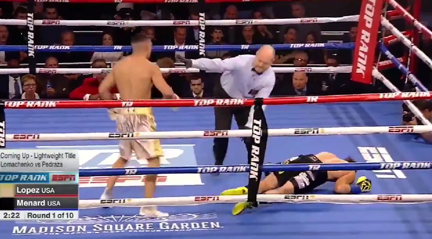 Με μια εκπληκτική μπουνιά, μόλις στα 44 δευτερόλεπτα του πρώτου γύρου, ο Λόπες (με ρεκόρ 11-0, 9 νοκ-άουτ) κατάφερε να ξαπλώσει στο ρινγκ τον Μέναρντ (με ρεκόρ 34-4, 24 νοκ-άουτ), για να πάρει μια εντυπωσιακή νίκη.