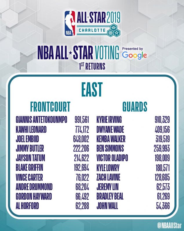 Αυτό φαίνεται τουλάχιστον από τα πρώτα αποτελέσματα μιας και ο Ελληνας σούπερ σταρ είναι πρώτος στην Ανατολή και δεύτερος συνολικά, πίσω μόνο από τον ΛεΜπρόν Τζέιμς των Λος Αντζελες Λέικερς. Οι παίκτες που ακολουθούν τον Γιάννη Αντετοκούνμπο στην ανατολική περιφέρεια είναι οι Κοουάι Λέοναρντ (Τορόντο), Τζοέλ Εμπίντ (Φιλαντέλφια), Ντουέιν Γουέιντ (Μαϊάμι) και Καϊρί Ίρβινγκ (Βοστώνη).