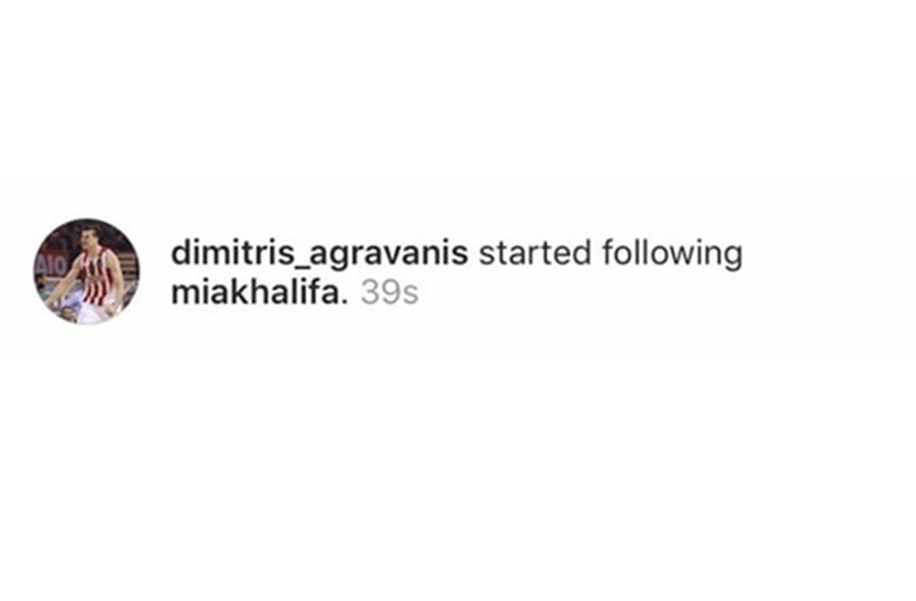 Πιο συγκεκριμένα ο Δημήτρης Αγραβάνης προχώρησε σε ένα follow –έπος καθώς ακολούθησε στον προσωπικό του λογαριασμό στο Instagram την πασίγνωστη πρωταγωνίστρια των ερωτικών ταινιών Μία Καλίφα.