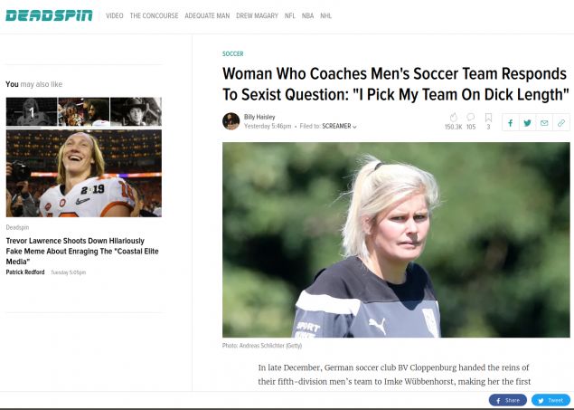 Είμαι επαγγελματίας. Τους επιλέγω στην ομάδα μου ανάλογα με το… μέγεθος του πέους τους», ανέφερε η 30χρονη προπονήτρια που έχει κάνει άνω-κάτω το ποδόσφαιρο στο κρατίδιο της Βόρειας Γερμανίας.