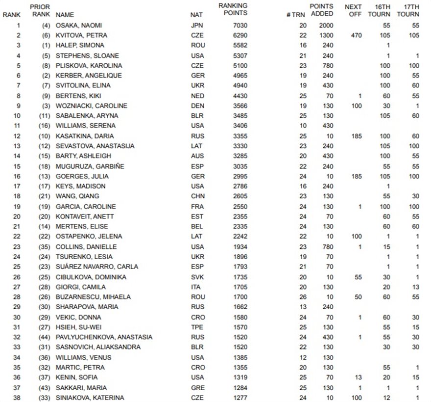 Στην πρώτη θέση ανέβηκε κερδίζοντας τρεις θέσεις η νικήτρια του Grand Slam της Μελβούρνης, Ναόμι Οσάκα, ενώ δεύτερη είναι η φιναλίστ, Πέτρα Κβίτοβα, που σημείωσε άνοδο τεσσάρων θέσεων. Τρίτη υποχώρησε η Σιμόνα Χαλέπ, που αποκλείστηκε νωρίς στην Αυστραλία.