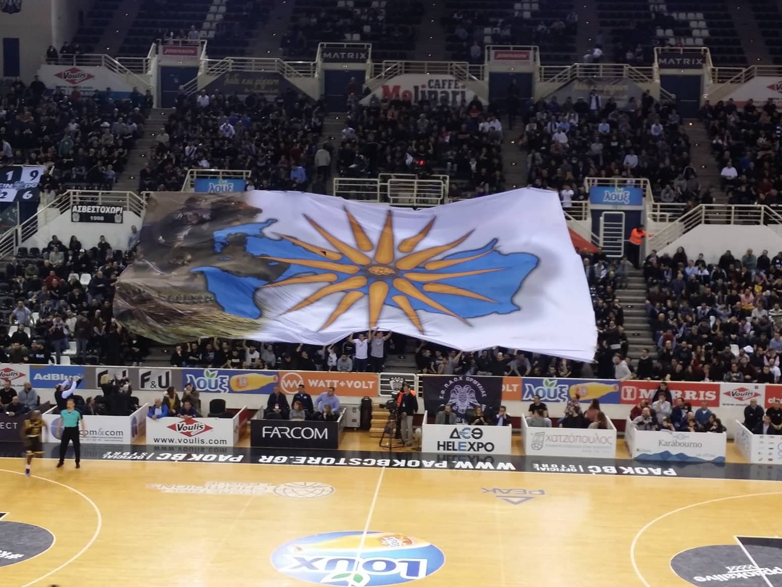 Πανό με τον ήλιο της Βεργίνας σήκωσαν οι οπαδοί του ΠΑΟΚ στην κεντρική κερκίδα του «PAOK Sports Arena», στον αγώνα με την ΑΕΚ για τη φάση των «16» του Basketball Champions League.