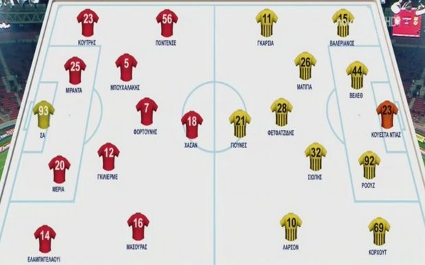 Oλυμπιακός: Σα, Ομαρ, Μεριά, Μιράντα, Κούτρης, Μπουχαλάκης, Γκιγιέρμε, Φορτούνης, Μασούρας, Ποντένσε, Χασάν