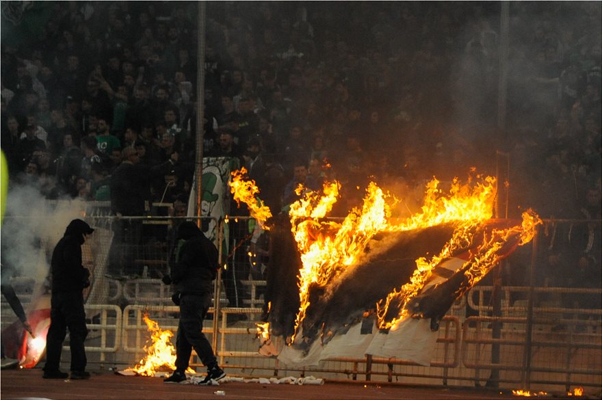 Η ένταση, όμως, παρέμενε καθώς στο ημίχρονο οι οπαδοί του Παναθηναϊκού έκαψαν πανό του Ολυμπιακού.