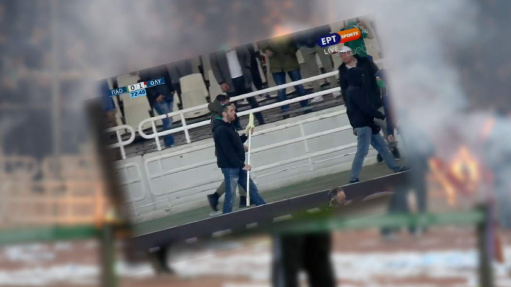 Μέσα στον πανικό, τις φωτιές, τα χημικά, τα ντου και την παράνοια, ένας άνθρωπος, με απόλυτη ψυχραιμία, βήμα σταθερό και επίγνωση της κατάστασης κυκλοφορούσε στο ταρτάν του γηπέδου κρατώντας αυτό που κανένας δε θα περίμενε να κρατάει.