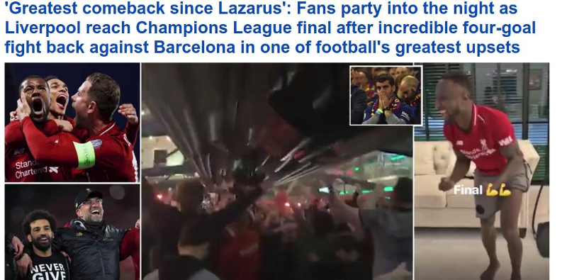 «Η Λίβερπουλ χρεώθηκε μία από τις μεγαλύτερες επιστροφές στην ιστορία του ποδοσφαίρου, καθώς είχε χάσει τον πρώτο αγώνα στην Βαρκελώνη με 3-0. Αλλά με 55.000 παθιασμένους οπαδούς τους να βρίσκονται στο Ανφιλντ, η ομάδα του Γιούργκεν Κλοπ σκόραρε τέσσερα γκολ για να ανατρέψει την ήττα και να κάνει μια επική νίκη», αναφέρει μεταξύ άλλων η Daily Mail.