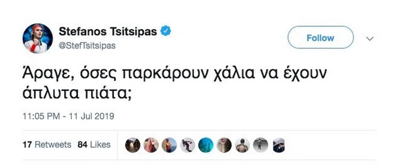 «Άραγε, όσες παρκάρουν χάλια να έχουν άπλυτα πιάτα;» έγραψε ο 20χρονος τενίστας το πρωί της Παρασκευής (12.07.2019) και από τα αρνητικά σχόλια που υπήρξαν, αναγκάστηκε να “κατεβάσει” το ποστάρισμα από τον λογαριασμό του.