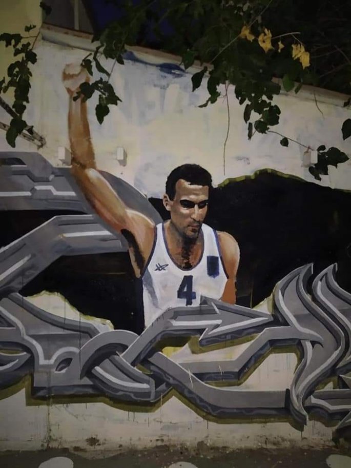 Το graffiti του Νίκου Γκάλη προ ημερών καταστράφηκε από αγνώστους, ωστόσο επανασχεδιάστηκε. Το νέο δημιούργημα του (άγνωστου) καλλιτέχνη απεικονίζει αυτήν τη φορά τον μεγάλο Έλληνα καλαθοσφαιριστή με τη φανέλα της Εθνικής ομάδας.