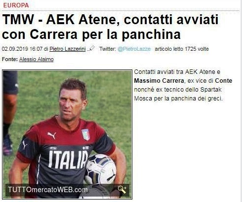 Παρά την εντυπωσιακή βελτίωση στην ποδοσφαιρική ομάδα της ΑΕΚ μετά την αποπομπή Καρντόσο και την ανάληψη της τεχνικής ηγεσίας από τον Νίκο Κωστένογλου, ο Έλληνας τεχνικός δεν φαίνεται να στεριώνει, καθώς το «tuttomercatoweb» στέλνει στον πάγκο της Ένωσης τον Μάσιμο Καρέρα.