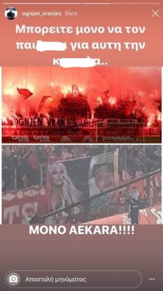 Μετά τα υβριστικά συνθήματα για την ομάδα του Πειραιά, οι οπαδοί της “απάντησαν” με πανό σχετικό με το σκάνδαλο στο οποίο συμμετείχε ο Βόσνιος αμυντικός, αλλά και ο ίδιος το έφθασε στα άκρα. Με instagram story μετά την ήττα της ΑΕΚ στο “Καραϊσκάκης” έγραψε χυδαίες λέξεις για τον κόσμο των “ερυθρόλευκων”, αλλά και τη Σέρβα τραγουδίστρια.