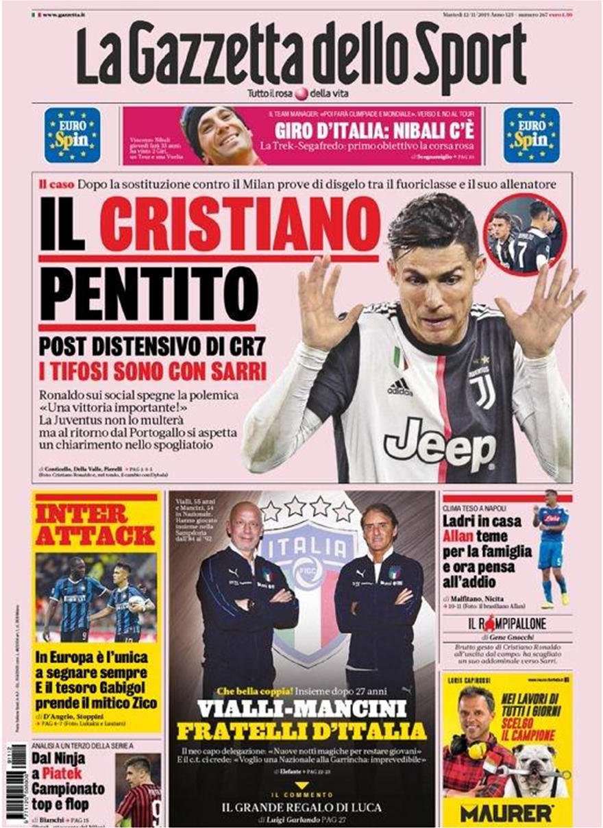Πρώτο θέμα στον ιταλικό αθλητικό Τύπο συνεχίζει να είναι η κακή αντίδραση του Κριστιάνο Ρονάλντο, όταν αντικαταστάθηκε από τον Μαουρίτσιο Σάρι στο 54ο λεπτό του αγώνα της Γιουβέντους με τη Μίλαν και στη θέση του μπήκε ο, σκόρερ του αγώνα, τελικά, Ντιμπάλα, με τον Πορτογάλο να αποχωρεί ενοχλημένος και πριν τη λήξη από το γήπεδο.
