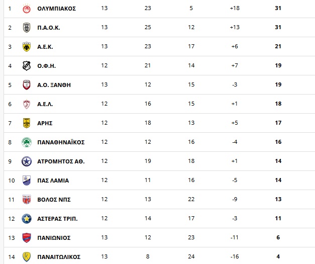 Δείτε τη βαθμολογία της Α΄ Εθνικής κατηγορίας ποδοσφαίρου μετά το πρώτο μισό της 13ης αγωνιστικής
