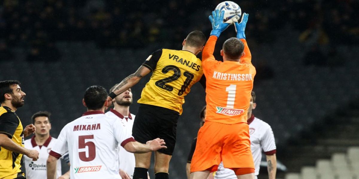 Στις καθυστερήσεις του πρώτου ημιχρόνου (45+2΄) και μετά από σέντρα του Ολιβέιρα, ο Σιμόες πετάχτηκε στην πορεία της μπάλας και με καταπληκτικό τακουνάκι άνοιξε το σκορ. Έως εκείνο το σημείο η ΑΕΚ αδυνατούσε να πατήσει περιοχή και δεν είχε δημιουργήσει την παραμικρή ευκαιρία. Όμως το εκπληκτικό γκολ του 30χρονου μέσου «έκοψε τα πόδια» των Λαρισαίων.
