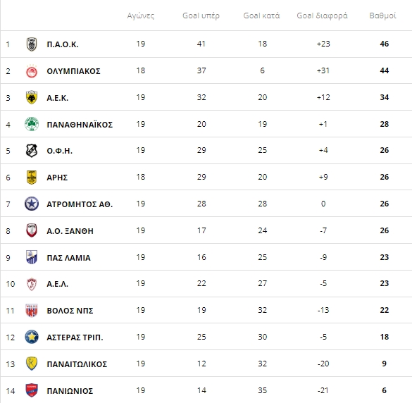 ΠΑΟΚ και Ολυμπιακός συνέχισαν με νίκες την πορεία τους στο πρωτάθλημα και έτσι η βαθμολογία του πρωταθλήματος δεν άλλαξε σε ό,τι αφορά τη «μάχη» για την κατάκτηση της κορυφής.