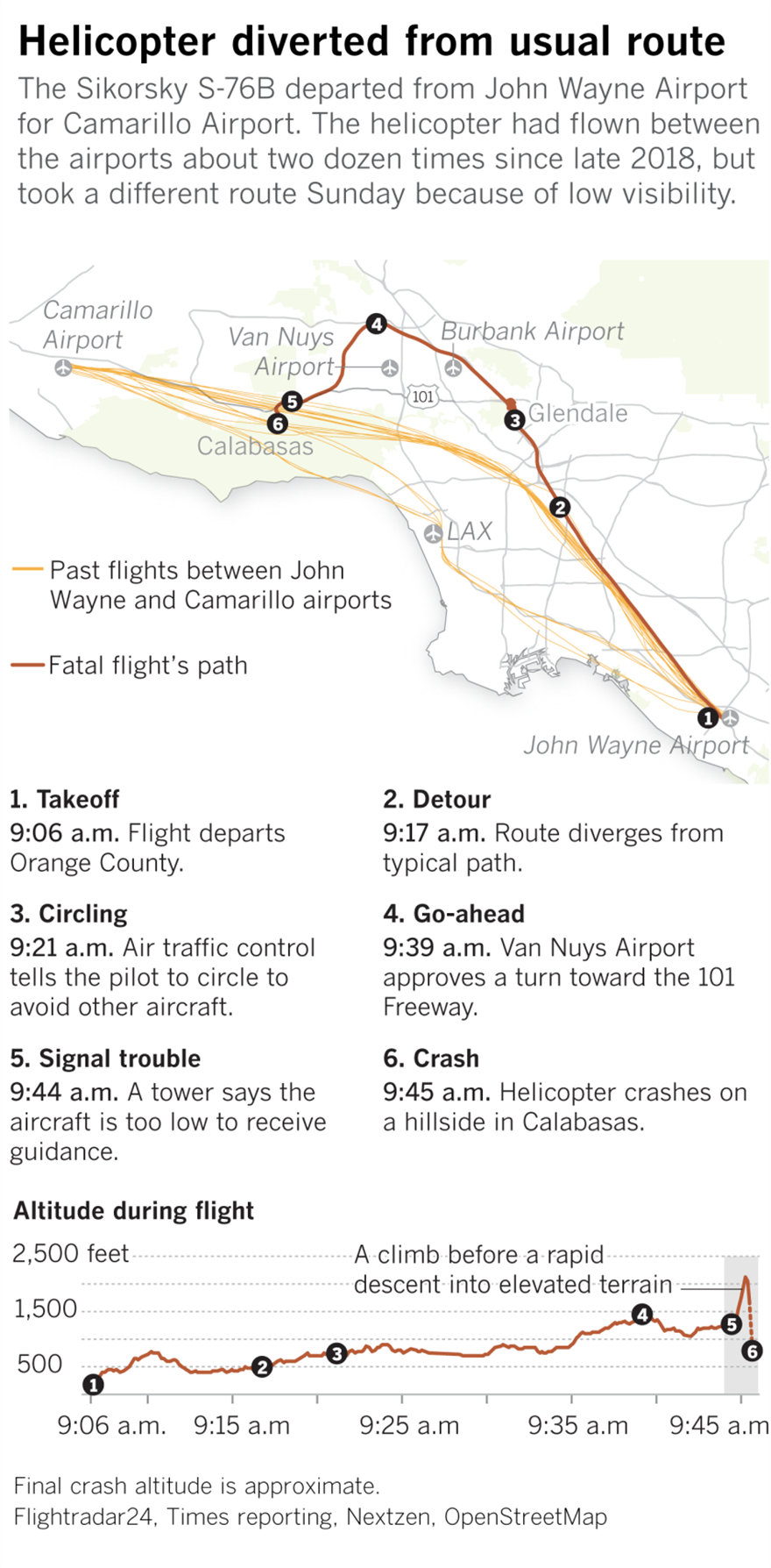 Είναι ενδεικτικό ότι, σύμφωνα με τους Los Angeles Times, το ελικόπτερο που είχε απογειωθεί από το αεροδρόμιο John Wayne με προορισμό το αεροδρόμιο Camarillo είχε πραγματοποιήσει το συγκεκριμένο δρομολόγιο πάνω από 20 φορές από τα τέλη του 2018 αλλά την Κυριακή επέλεξε διαφορετική διαδρομή λόγω της χαμηλής ορατότητας.
