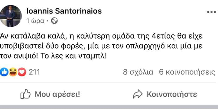 Συγκεκριμένα ανέφερε: «Αν κατάλαβα καλά, η καλύτερη ομάδα της τετραετίας θα είχε υποβιβαστεί δύο φορές, μία με τον οπλαρχηγό και μία με τον ανιψιό! Το λες και νταμπλ».