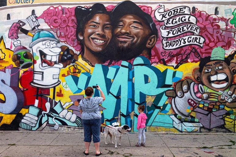 Στον τοίχο της Pickford Market στην Washington Boulevard, ο Jules Muck χρειάστηκε μόλις έξι ώρες να ολοκληρώσει μια καινούργια τοιχογραφία με τον Κόμπι και την κόρη του Τζιάνα – ήταν και εκείνη στο μοιραίο ελικόπτερο – να έχουν γείρει τα κεφάλια τους ο ένας προς την άλλη και τα μάγουλά τους να ακουμπούν. Η λεζάντα; «Kobe & Gigi Forever. Daddy’s Girl».
