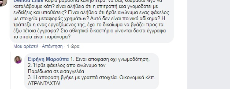 Η κ. Μαρούπα, μέλος της ΕΕΑ, τόνισε με σχετικό ποστάρισμά της στο Facebook – και μετά από ερώτηση που της έγινε για τα στοιχεία που εστάλησαν χωρίς επώνυμο αποστολέα – για την υπόθεση ΠΑΟΚ – Ξάνθη ότι: