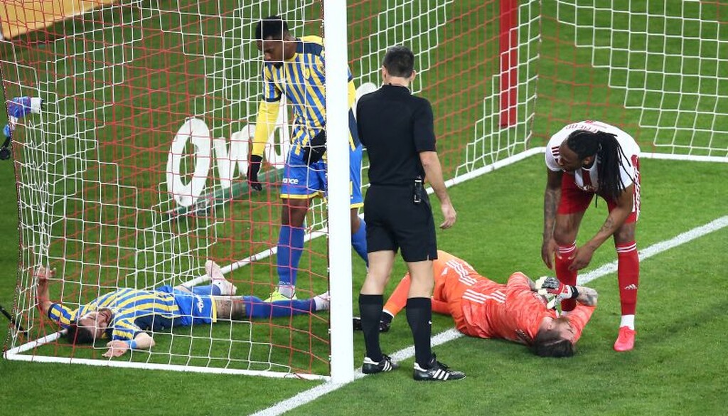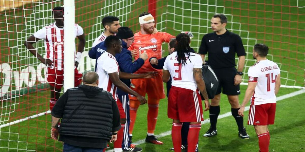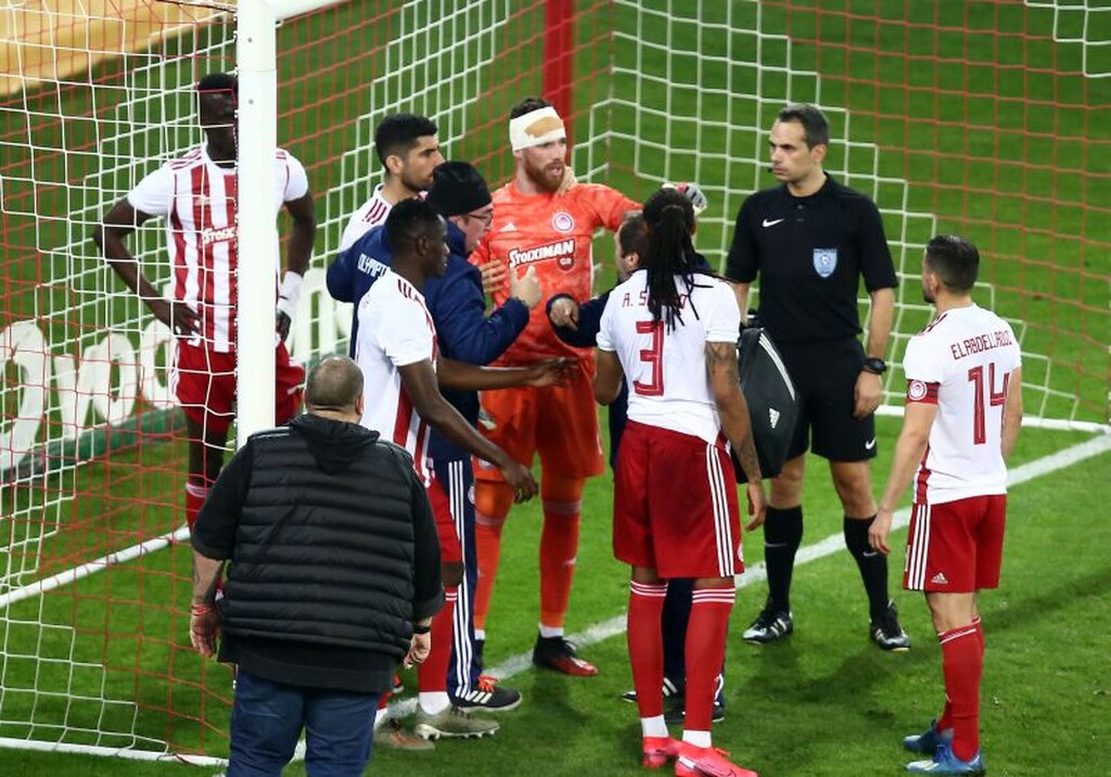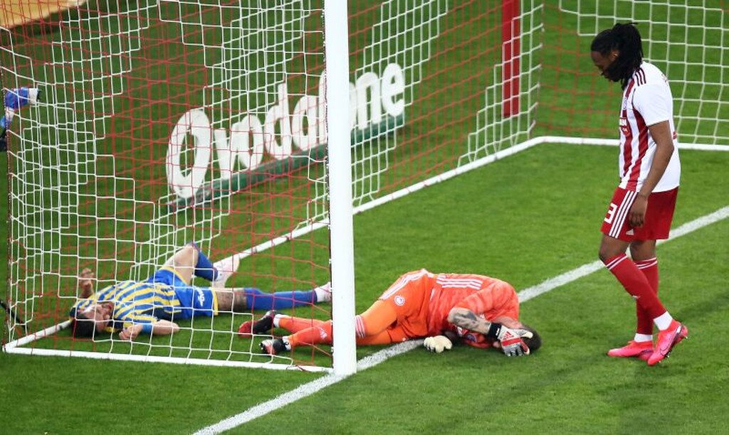 Ο Γάλλος της ομάδας του Αγρινίου προσπάθησε να φτάσει στη μπάλα με προβολή αλλά βρήκε το μέτωπο του τερματοφύλακα του Ολυμπιακού που έμεινε για ώρα στο χορτάρι!