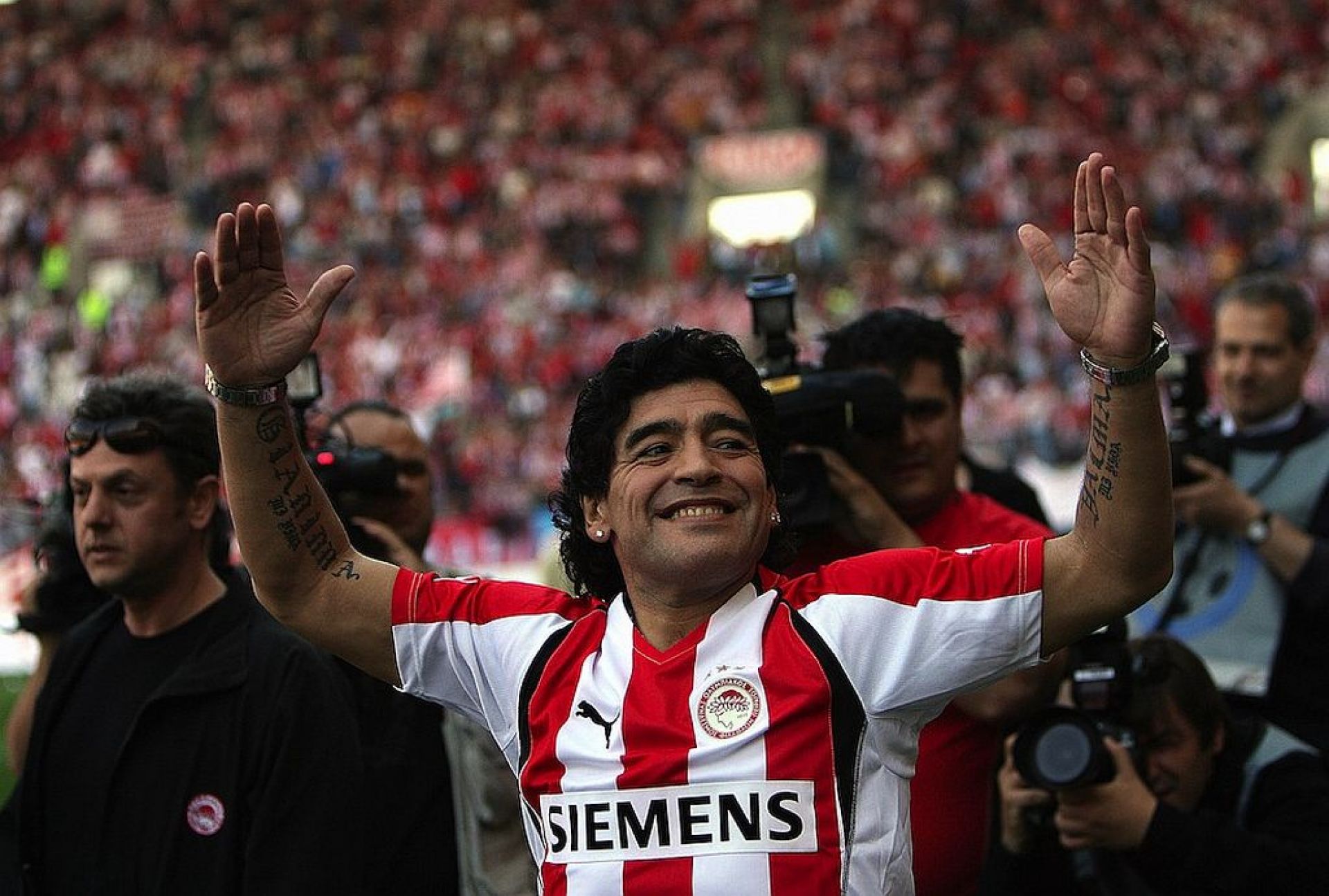 Σε αυτή ο Μαραντόνα φοράει μάλιστα και τη φανέλα των “ερυθρόλευκων”, παίζοντας… πασούλες με τον Ριβάλντο.