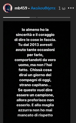 «Τουλάχιστον έχω την ειλικρίνεια και το κουράγιο να λέω τα πράγματα πρόσωπο με πρόσωπο. Είχες τόσες ευκαιρίες να το κάνεις αυτό από το 2013, να συμπεριφερθείς σαν άντρας, αλλά δεν το έκανες. Ποιος ξέρει τι θα λες μια μέρα για τους τωρινούς συμπαίκτες σου, περίεργε αρχηγέ. Αν αυτό σημαίνει να είσαι πρωταθλητής, τότε προτιμώ να μην είμαι. Και δεν έδειξα ποτέ έλλειψη σεβασμού προς την Ατζούρι φανέλα».